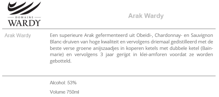 Een superieure Arak gefermenteerd vanObeidi, Chardonnay & Sauvignon Blanc kwaliteitsdruiven - Alcohol 53% - Volume 750ml